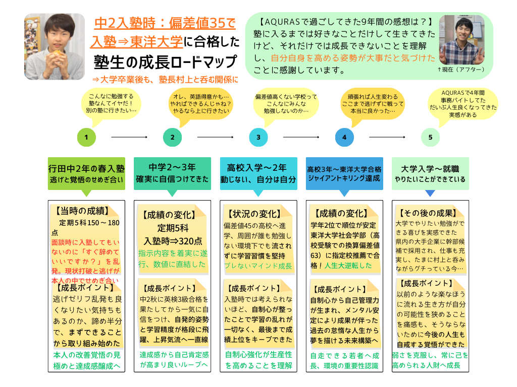 戦略設計学習塾AQURASでは、数年単位でしっかり時間をかけて「どこに出しても恥ずかしくない人財」に育てます。