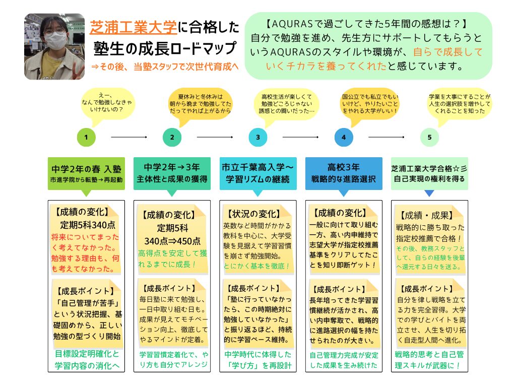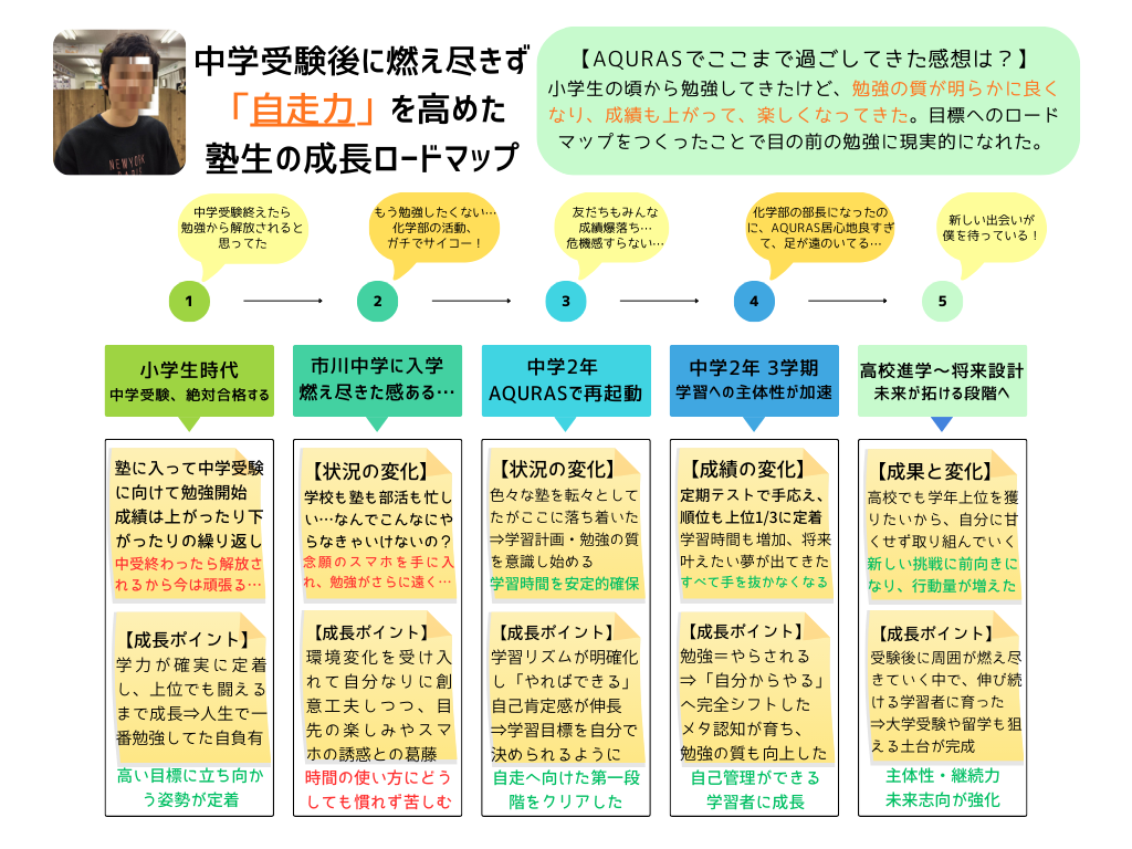 学力だけでなく、自己管理力をはじめ、自立性や主体性などの人間力を身につけた在塾生&卒塾生たちの実際の成長記録です。