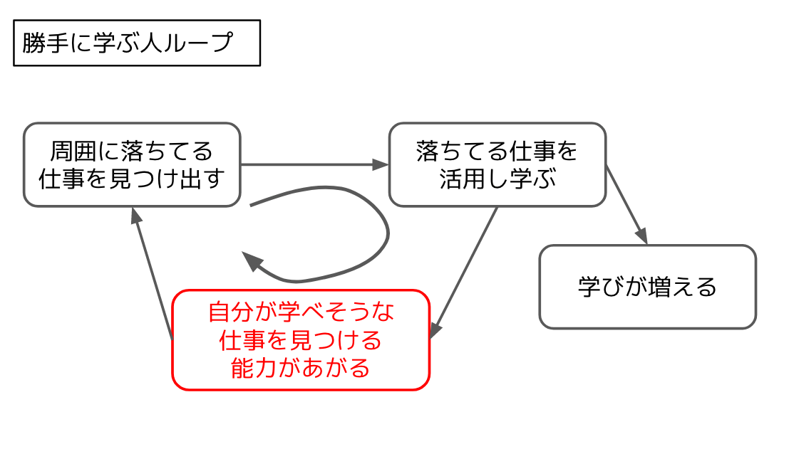 勝手に学ぶ人って、自分の周囲にある「学びに使えそうな仕事」を探して自分の仕事にすることを繰り返す習性があります。