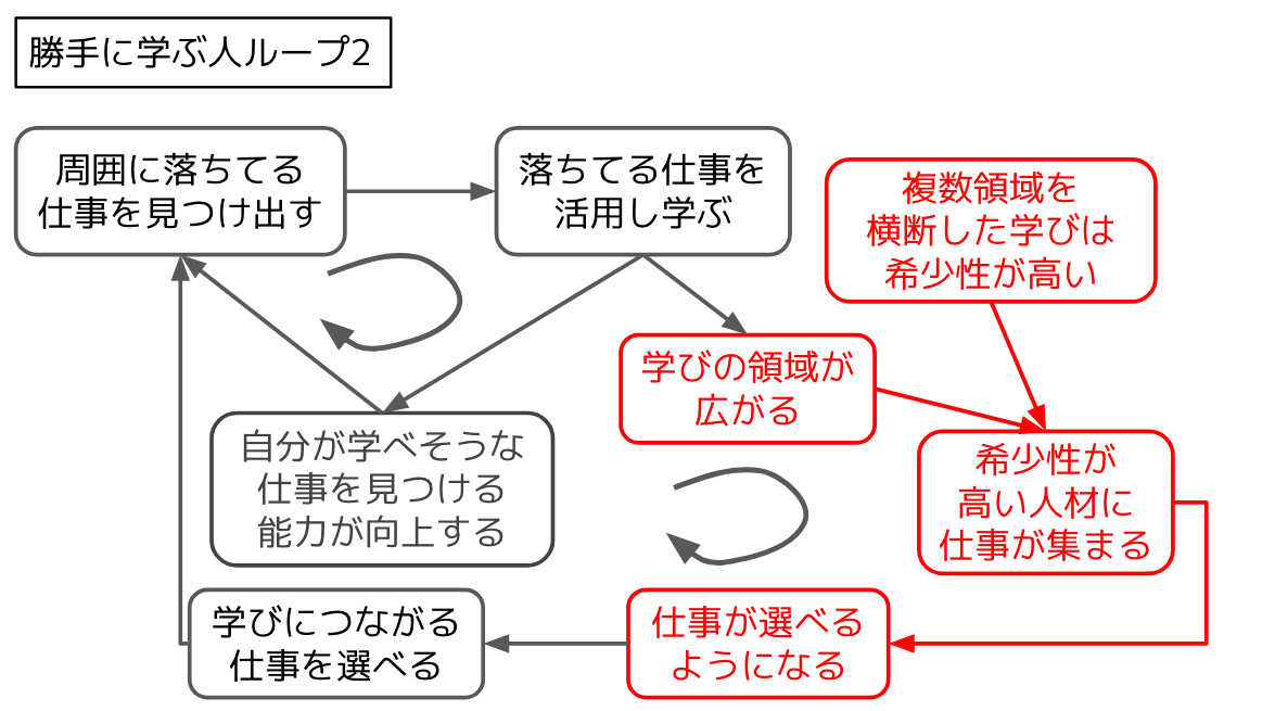 そして、いろいろ学んでいくうちに「領域を横断した学び」となり希少性が高い人材になり、そうなっていくと、より仕事が選べるようになります。学びのループが強化されるからです。結果、稼ぐチカラに直結していくというね。