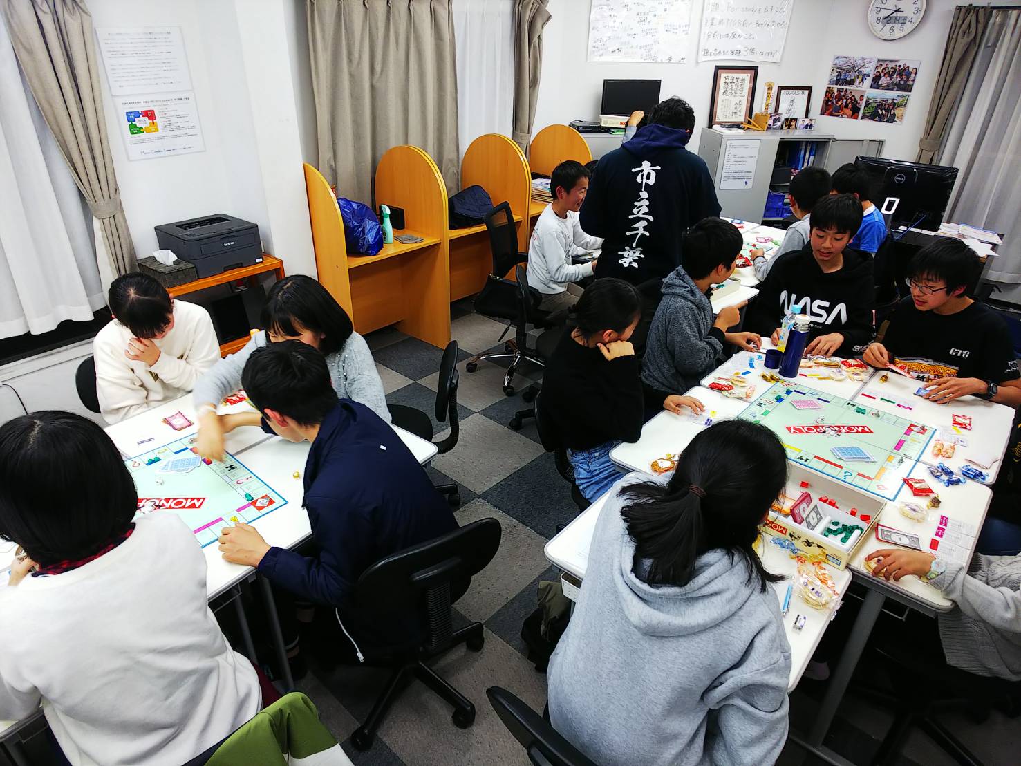前回同様に塾生参会者もその友人関係者も多く、限られたリソースを使っていかに自分の資産を増やしつつ相手を弱体化させて自己破産に追い込むか、競売でいかに落札値を釣り上げるだけ釣り上げて一瞬のタイミングを見切って手を引くか…など、何度も参加している塾生たちは着々と悪知恵がついてきますので、勝利をもぎとるためには手段を選ばない冷徹さを持ちつつも、基本的には熱い取引が展開された大会でした。