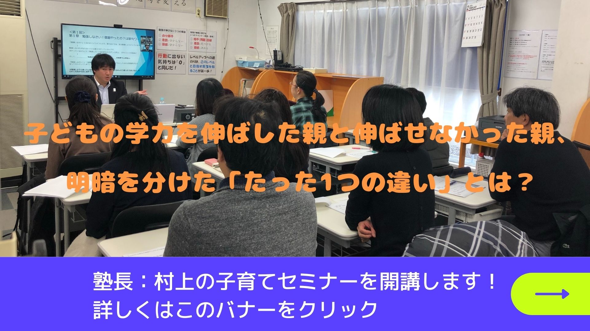 なので、小学生・中学生のお子さんをお持ちのお父さんお母さん対象で、以前にも開講した村上の子育てセミナーを再度開講しようかなと思います。