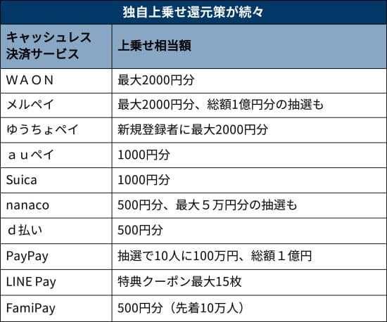 例えばメルカリの子会社メルペイ(東京・港)は3日、従来1000円分だった上乗せ還元額を2000円に倍増させた。別途、抽選で総額1億円分の還元も追加するという。各社は赤字覚悟で顧客囲い込みを急いでおり今後も追加の一手が出てくる可能性は高い。