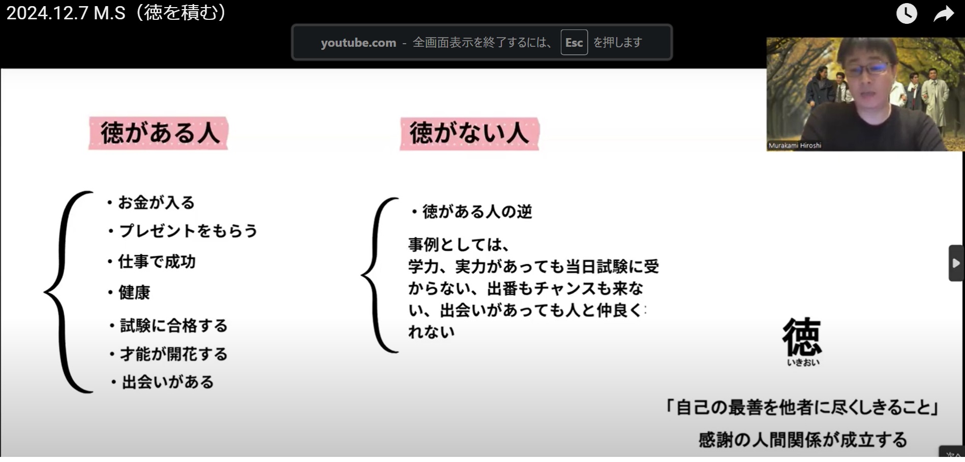 なので、自分を大切にすることは言うまでもないんですが、それと同じぐらい他者への配慮や見返りを求めずに尽くしたり与えたりすることの大切さを、今回は塾生たちへの生き方のヒントとして、延々と村上は話させてもらった感じです(笑)。