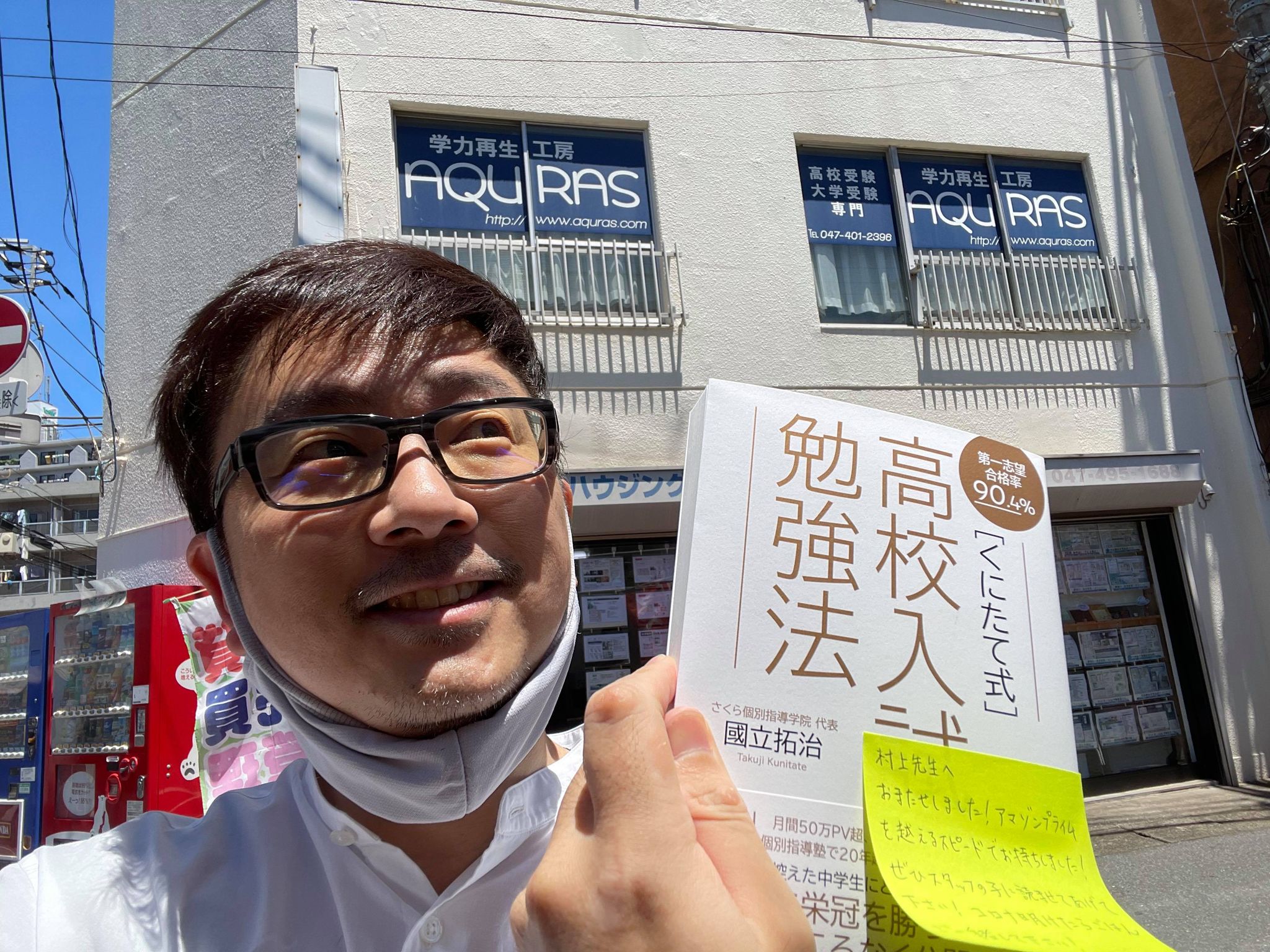 お休みだった昨日、月間50万PVを誇る塾業界の大物:塾ブログの国内第一人者である愛知県岩倉市のさくら個別指導学院:國立 拓治 先生が、なんとご自身の新しい著書「第一志望合格率90.4% くにたて式高校入試勉強法」を持って西船橋工房に弾丸訪問されたとのこと。(もちろん、他の重要案件のついででw)
