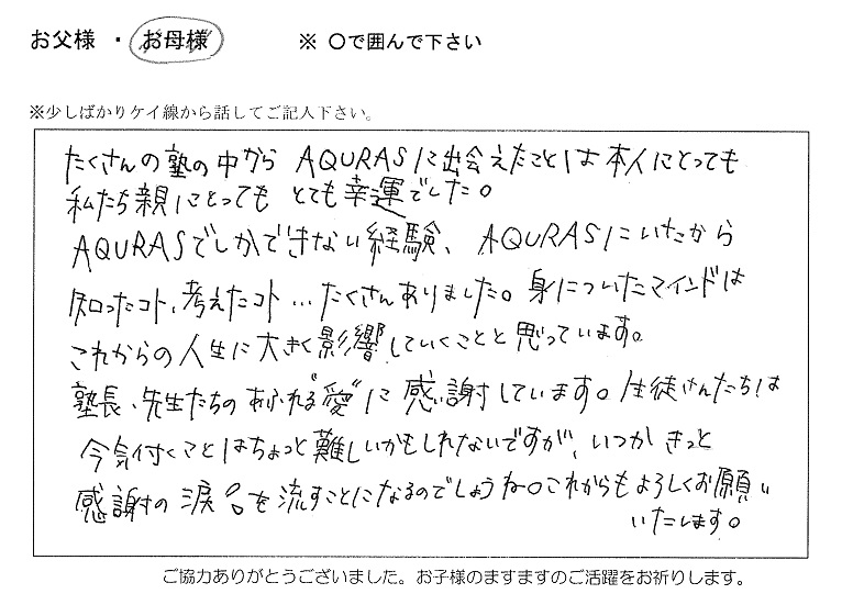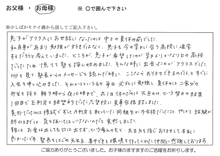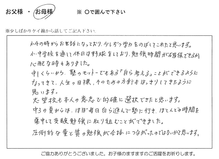 今年も志望校に合格した塾生の親御さんより、ありがたいお言葉を頂戴しております。