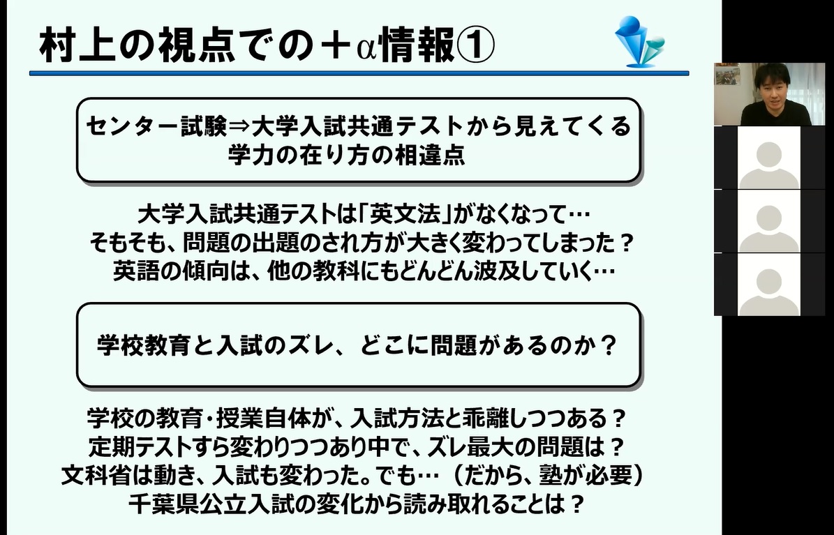 さて、先日Zoomにて開催した当塾初の保護者会、これまでは親御さん・お子さんとの三者懇談だったのですが、お伝えしたい入試情報も多かったこともあり、敢えて一斉実施としてみましたが、親御さんからは「ためになった」「役立った」というコメントを多く頂戴しております。