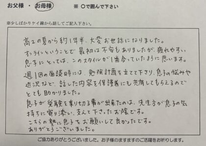 戦略設計学習塾AQURASでのオンライン指導で「大学合格を勝ち取った」ご家庭より