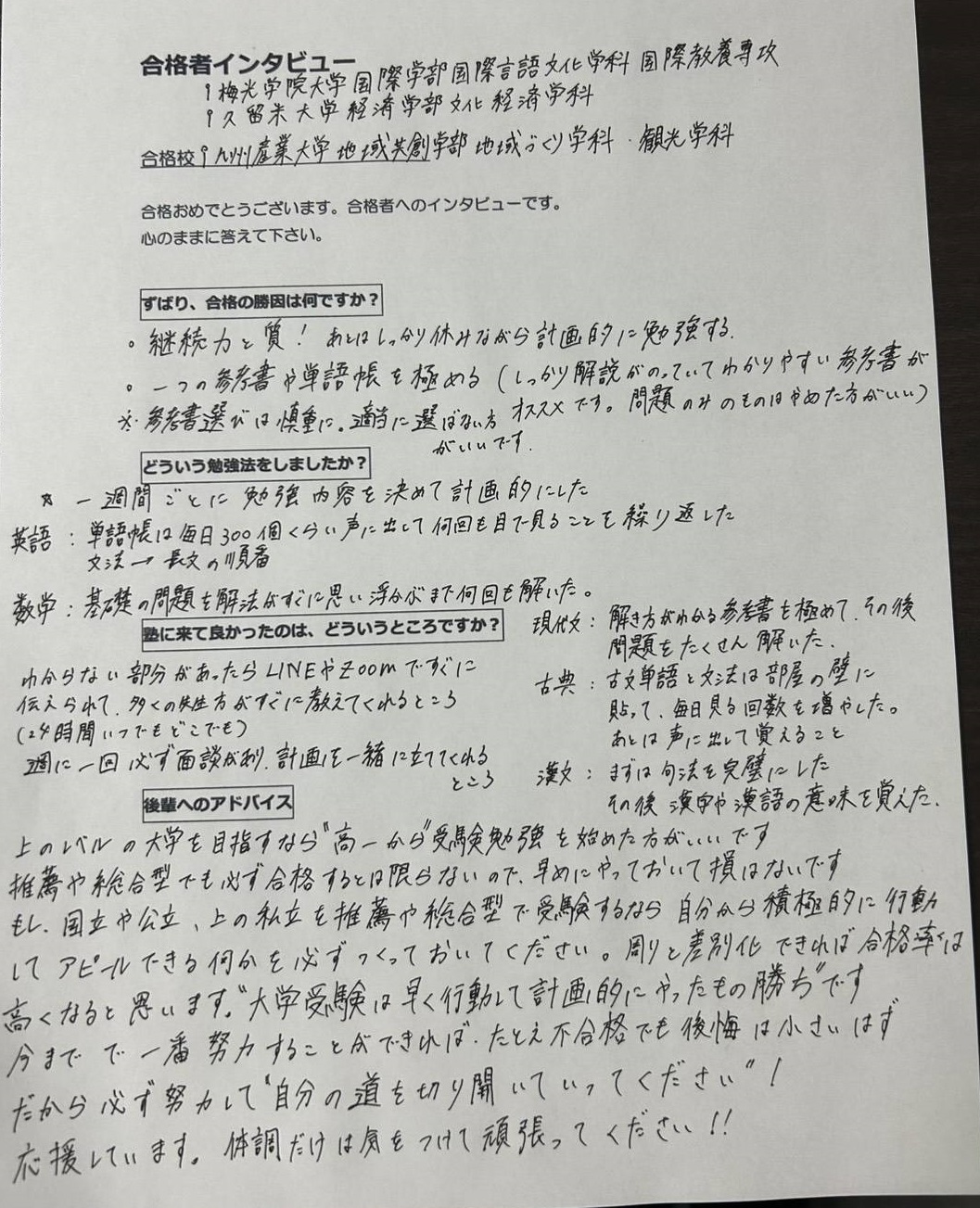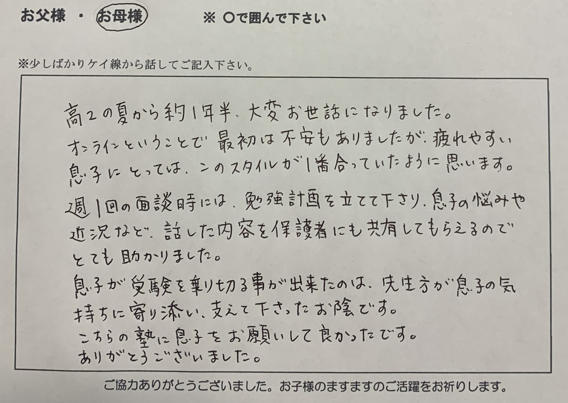 戦略設計学習塾AQURASでのオンライン指導で「大学合格を勝ち取った」ご家庭より